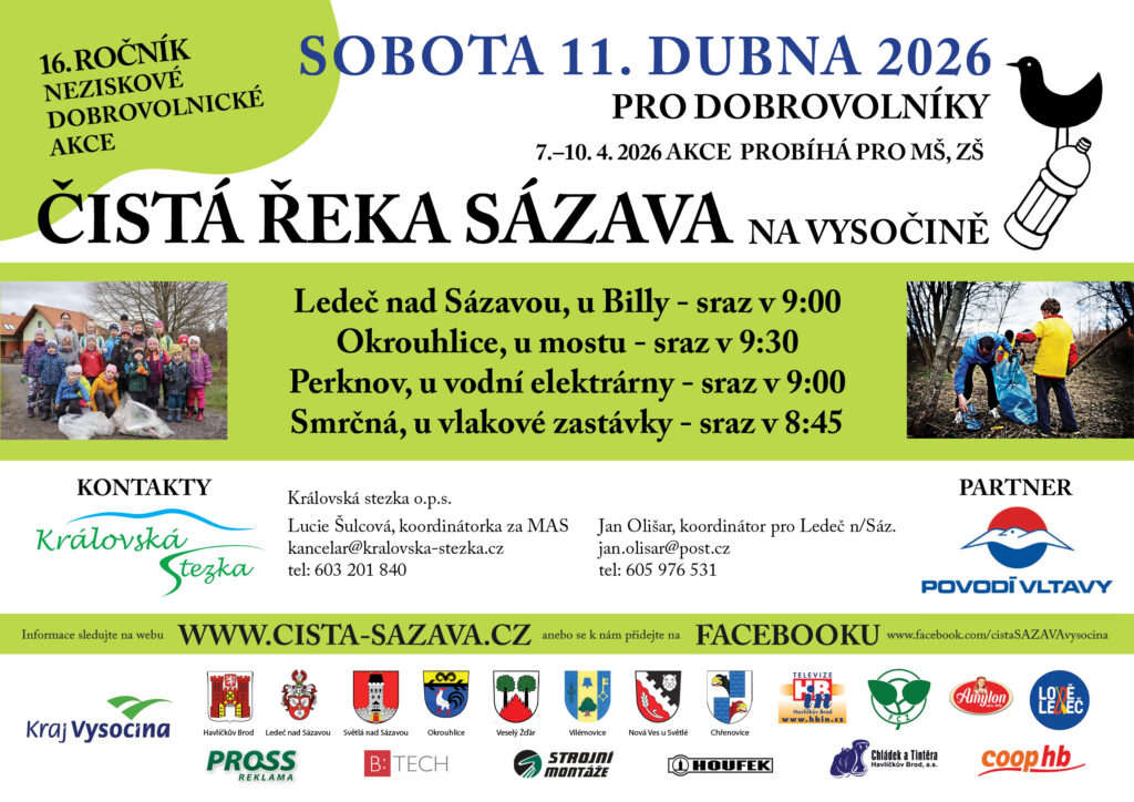 Ve dnech od 7. do 12. dubna proběhla na Vysočině každoroční ekologická akce Čistá řeka Sázava, která se zaměřila na úklid úseku řeky mezi Havlíčkovým Brodem a Chřenovicemi. Během tohoto týdne spojily síly školy, organizace i dobrovolníci (cca 800 dobrovolníků všech věkových kategorií, kterým patří díky za jejich odvedenou práci) a společně pomohli vrátit řece její přirozenou krásu. Výsledkem bylo vyčištění přibližně 60 kilometrů toku Sázavy a odklizení stovek kilogramů odpadu. Koordinaci akce zajišťovala ve spolupráci s Povodím Vltavy Královská stezka o.p.s.